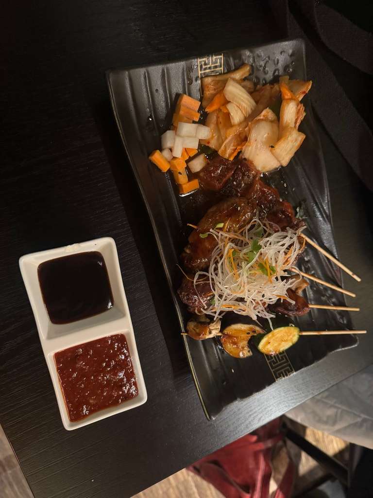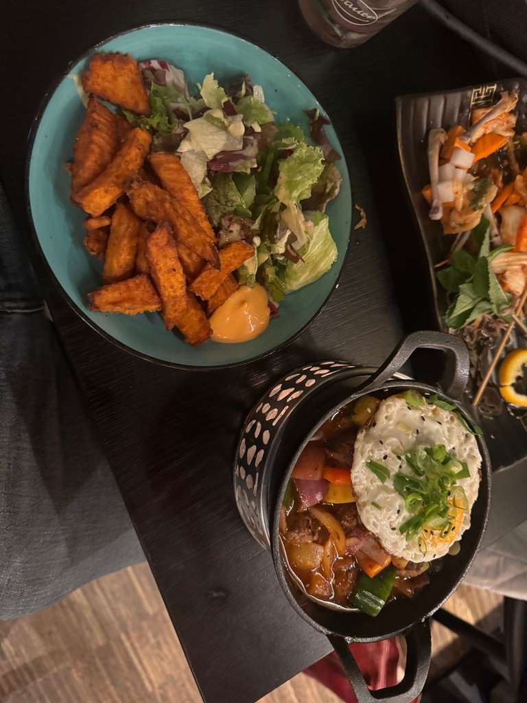 Dinner at Rice & Shine, a cozy spot with flavorful dishes and the comforting hum of quiet conversation.